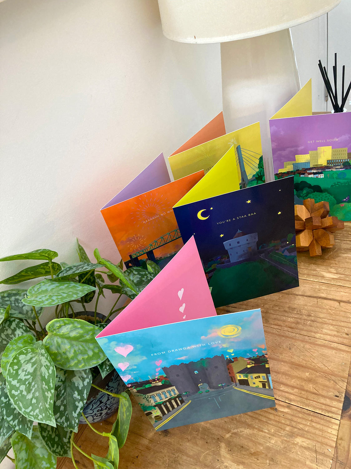 The theme is 'From Drawda with Love' and featured 5 local landmarks and 5 specific views at different entrance points to the town. 5 common card-giving occasions were catered for, and local speak/slang was incorporated into the greetings.