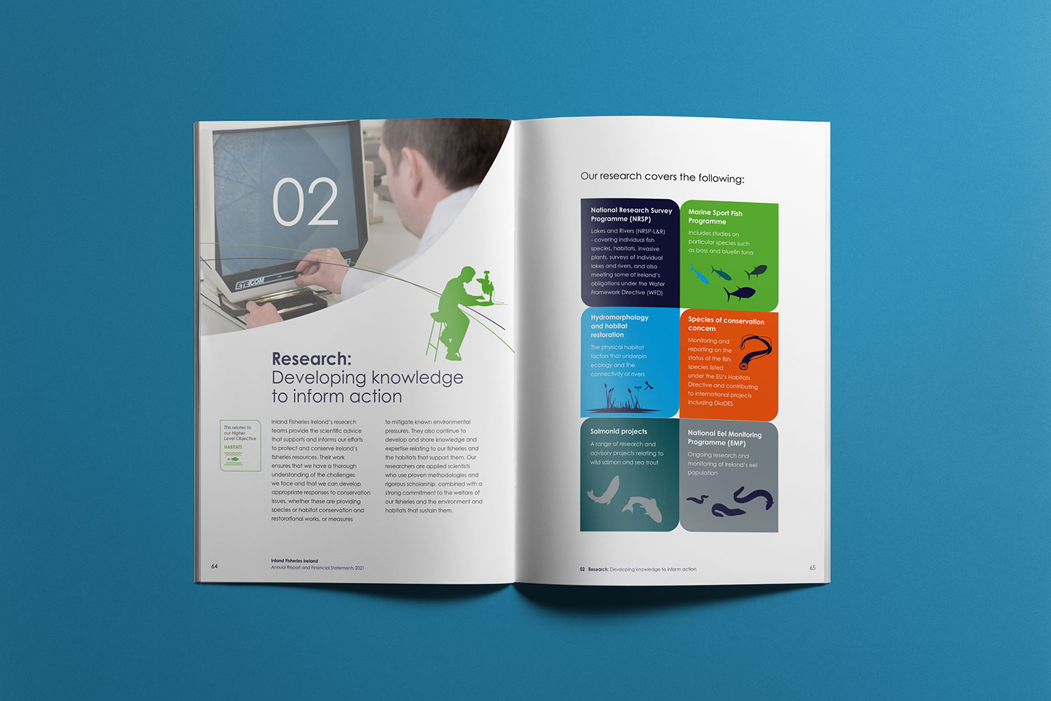 Bammedia was awarded the tender to design and produce the Annual Reports for Inland Fisheries Ireland, covering the period from 2021 to 2025. The brief centred on transforming supplied content and established brand guidelines into a cohesive, high-quality suite of publications. This involved structuring complex information in a clear, accessible way and using thoughtfully designed infographics to enhance understanding and engagement across the reports.